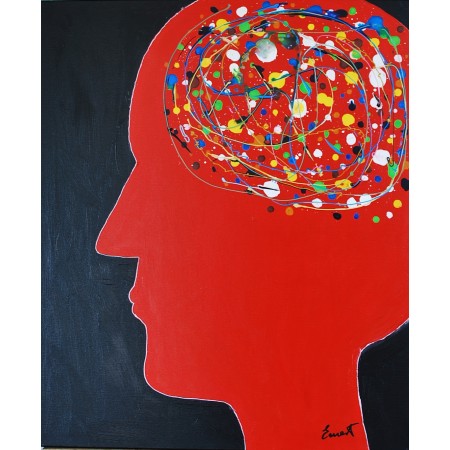 En esta obra, empleé acrílicos y técnicas de impresión en relieve para explorar la complejidad de los pensamientos humanos. El perfil en rojo...