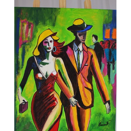 En esta obra, he plasmado la vibrante energía de una pareja que camina confiadamente en un...