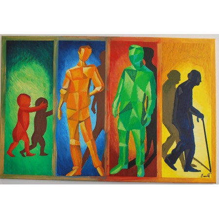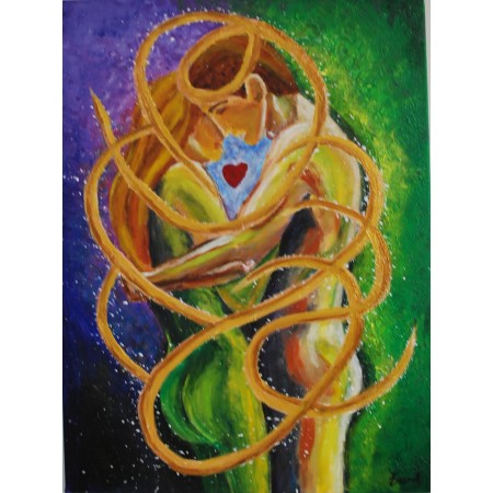 En este lienzo retrato dos figuras fusionadas en un abarazo íntimo, envueltas por una...