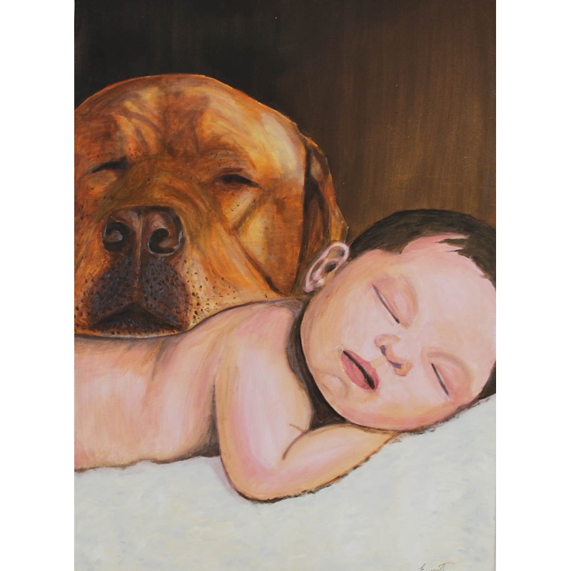 En esta obra, capturé la serenidad y la conexión incondicional entre un niño y su perro, ambos sumidos en un profundo sueño. Utilicé acrílicos para resaltar la suavidad y calidez del momento. Mi intención era transmitir un mensaje de paz y amistad verdadera, elementos que, al añadirlos a cualquier hogar, aportarán una sensación de amor y tranquilidad.