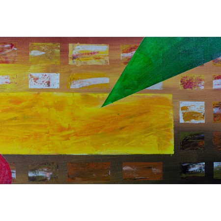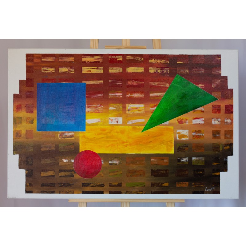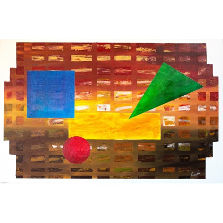 En esta obra he trabajado sobre la colocación artistica de las formas básicas de un cuadrado, un rectangulo, un triangulo y un circulo de una forma armónica, sobre lo que podría interpretarse como un edificio colmena moderno.