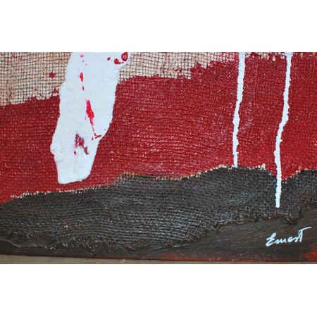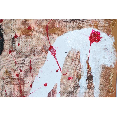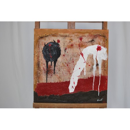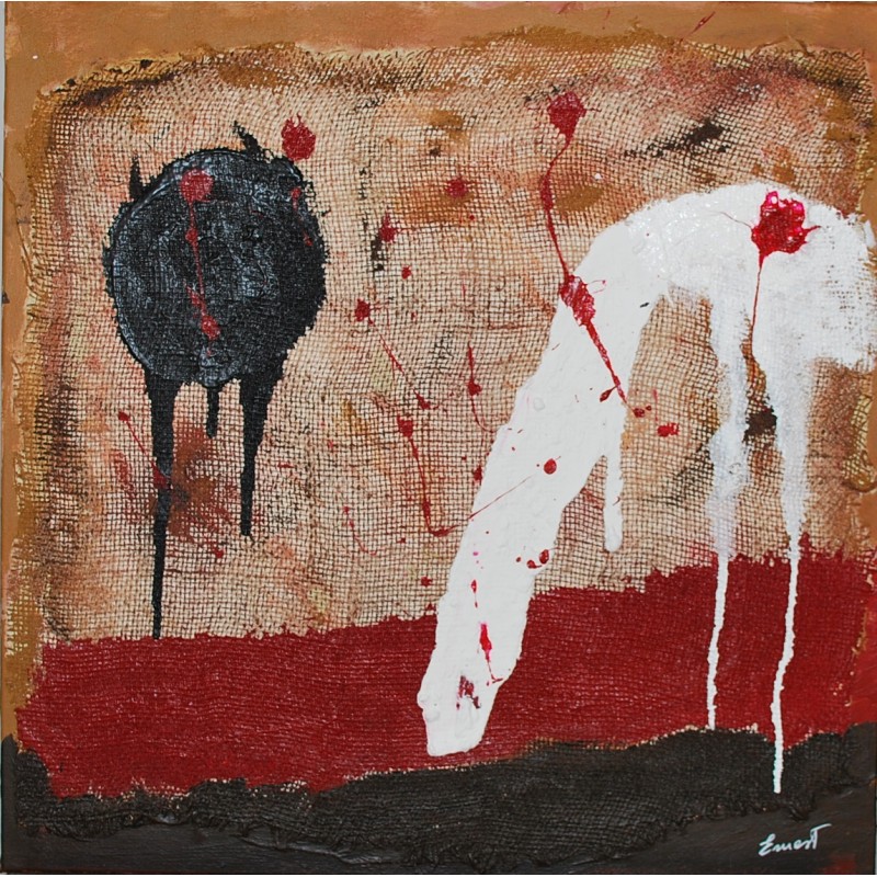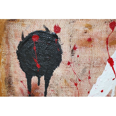 Mi obra es una danza visual de texturas y simbolismo, donde empleé acrílicos, técnicas de grabado en relieve y elementos orgánicos como tierra y arena. La tela de saco y el yeso añaden dimensiones táctiles. Es un cuadro abstracto que canaliza la esencia de un espíritu indomable, transmutando las emociones crudas en una representación simbólica, del maltrato a animales, representados por un toro y un caballo, sobre un charco de sangre. Su energía abstrusa y profunda enriquecerá cualquier espacio, invitando a la reflexión y al diálogo interior.