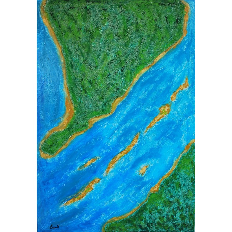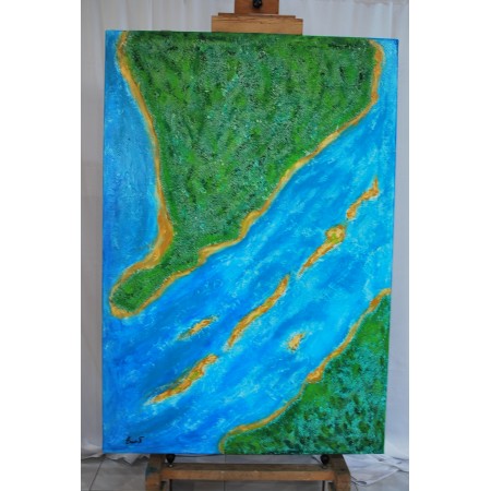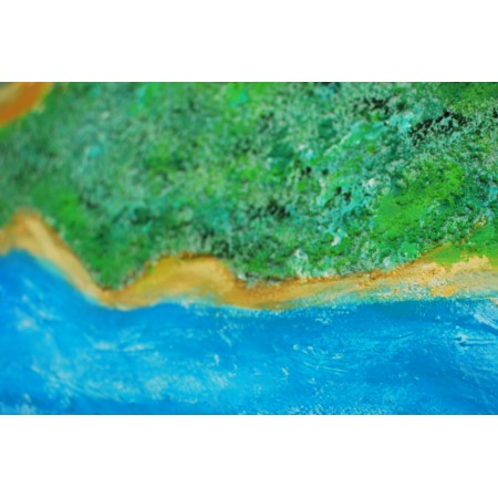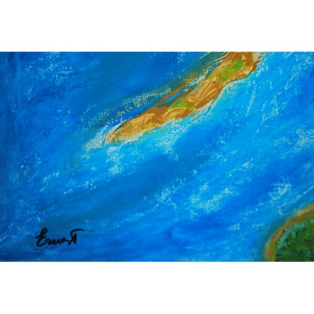 En esta obra, fusioné acrílico, grabado en relieve, resina, tierra y arena para capturar la energía viva y etérea de la naturaleza. Mi inspiración proviene de la majestuosidad de los paisajes terrestres y acuáticos, que intento representar en un estilo semiabstracto. Refleja un dialogo entre la tierra y el mar, un juego de texturas y colores que invita al espectador a explorar y sentir la fuerza y serenidad de la naturaleza. Esta pieza aportará a cualquier espacio un soplo de vitalidad y un toque de reflexión profunda sobre nuestro entorno.