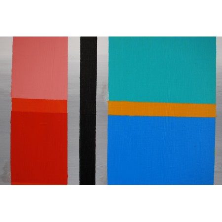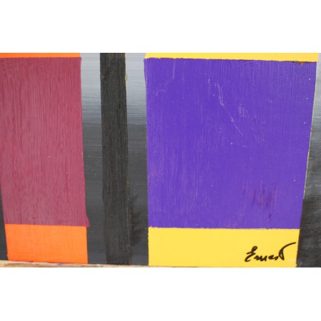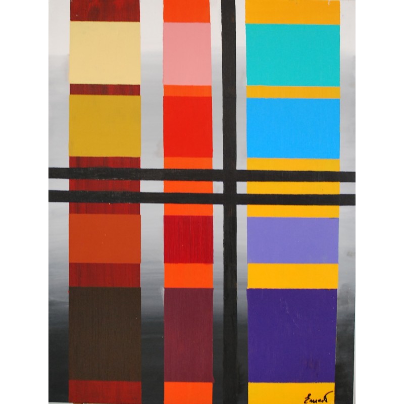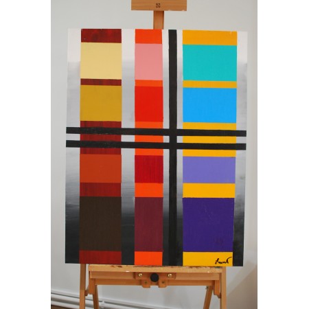 La obra de arte presenta tres columnas verticales compuestas por rectángulos horizontales meticulosamente dispuestos. Cada rectángulo está definido por un color distinto y vívido, que crea un ritmo hipnótico y un equilibrio visual.Este patrón de cuadrícula no solo fundamenta los colores dinámicos, sino que también invita a la contemplación del orden frente al caos.