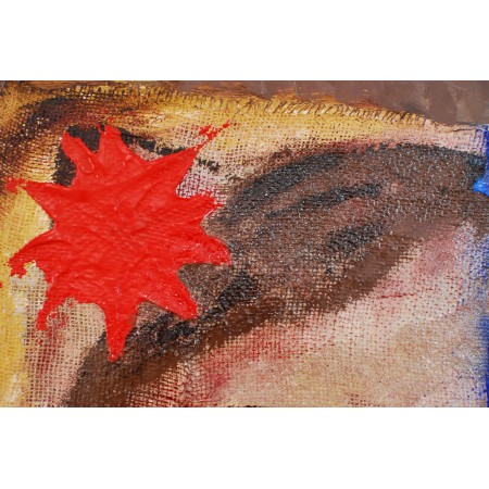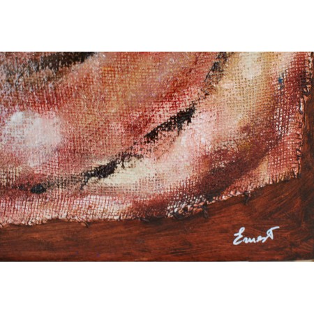 Lienzo extendido sobre marco de madera, pintado a mano con técnicas acrílicas, tejido, texturas y acabado con epoxi. De medidas 65 x 85 x 4 cm.