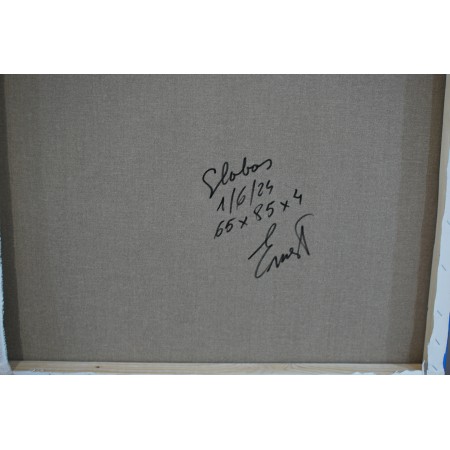 Lienzo extendido sobre marco de madera, pintado a mano con colores acrílicos, de medidas 65 x 85 x 4 cn.