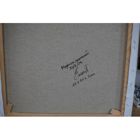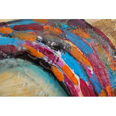 Lienzo extendido sobre marco de madera, pintado a mano con técnicas acrílicas, tela, textura, colage y epoxi, de medidas 60 x 81 x 2 cm.