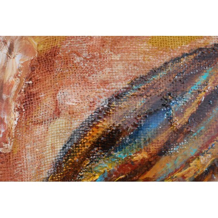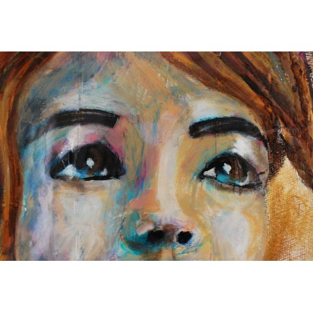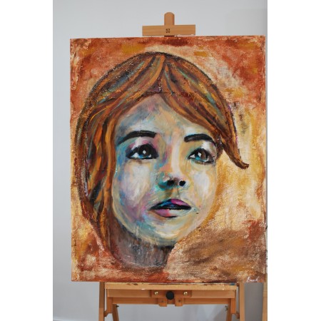 Esta cautivadora obra de arte presenta una representación intrigante de un rostro femenino pintado sobre lo que parece ser un lienzo texturizado. El artista emplea una paleta de colores vibrante y dinámica, en la que predominan los tonos naranja, marrón, verde azulado y toques sutiles de azul, que crean una imagen evocadora y emocionalmente resonante. La expresión del rostro transmite una sensación de pensamiento profundo e introspección.En general, esta pieza se destaca por su profundidad emocional, el juego de colores y la representación conmovedora de la vida interior del sujeto. Invita a los espectadores a ahondar en sus propias reflexiones e interpretaciones, lo que la convierte en una adición que invita a la reflexión en el mundo del retrato contemporáneo