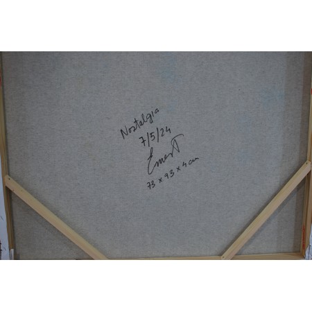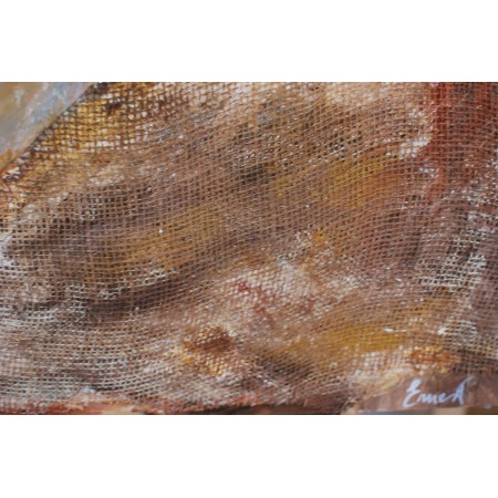 Lienzo extendido sobre marco de madera, pintado a mano con técnicas acrílicas, tela de saco, colage, terminado en epoxi, de medidas 73 x 93 x 4 cm.