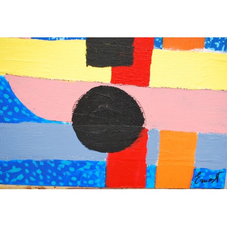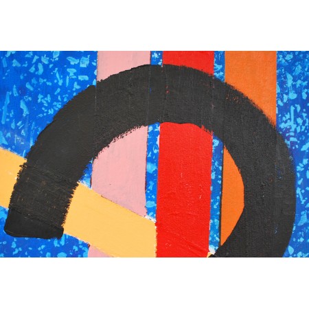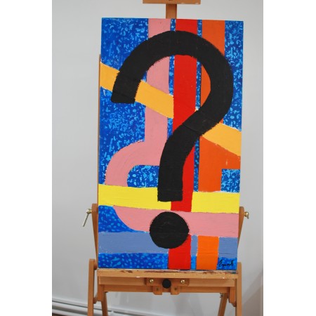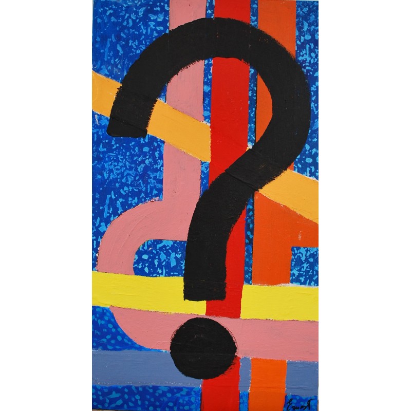 Esta sorprendente obra de arte presenta un gran y llamativo signo de interrogación representado en negro, que domina el lienzo y sirve como punto focal. El fondo es un conjunto ecléctico y vibrante de formas y tonos geométricos, que incorpora una paleta audaz de rojo, naranja, amarillo, rosa y azul. El signo de interrogación negro se arquea a través de estos colores y formas en capas, yuxtaponiendo la fluidez de las curvas del signo de interrogación con la rigidez de las líneas nítidas y los bloques rectangulares.Su juego de colores y formas, combinado con la imponente presencia del signo de interrogación, hace de esta obra de arte una profunda interrogación visual y un testimonio del poder perdurable de la curiosidad y la contemplación en el arte.