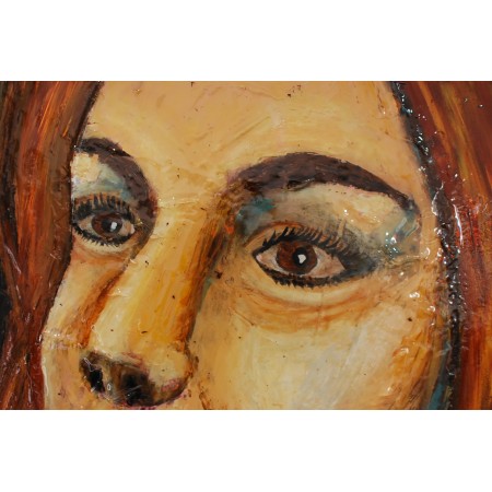 Lienzo extendido sobre marco de madera, pintado a mano con técnicas acrílicas, texturados, colage y acabado con epoxi, de medidas 81 x 100 x 4 cm.