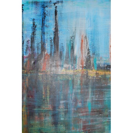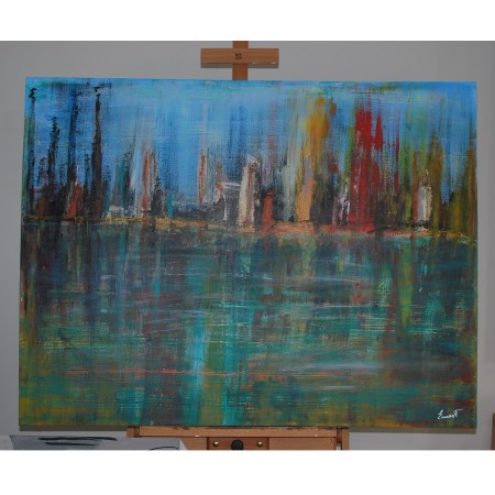 Imagen abstracta, que a través de una serie de manchas indefinidas puedes descubrir una de imagen de los edificios de una ciudad y al lado las siluetas de unas fabricas y e primer plano el gran lago con sus reflejos.