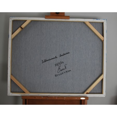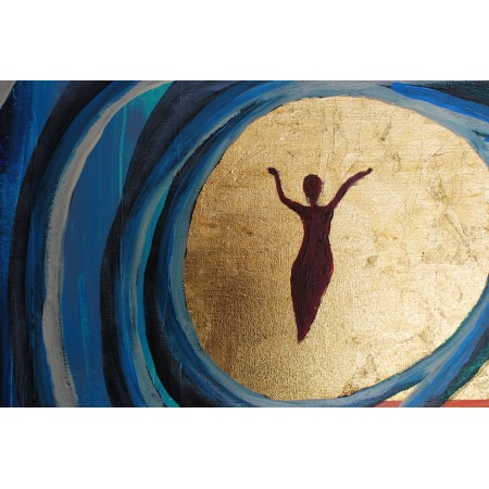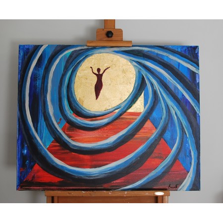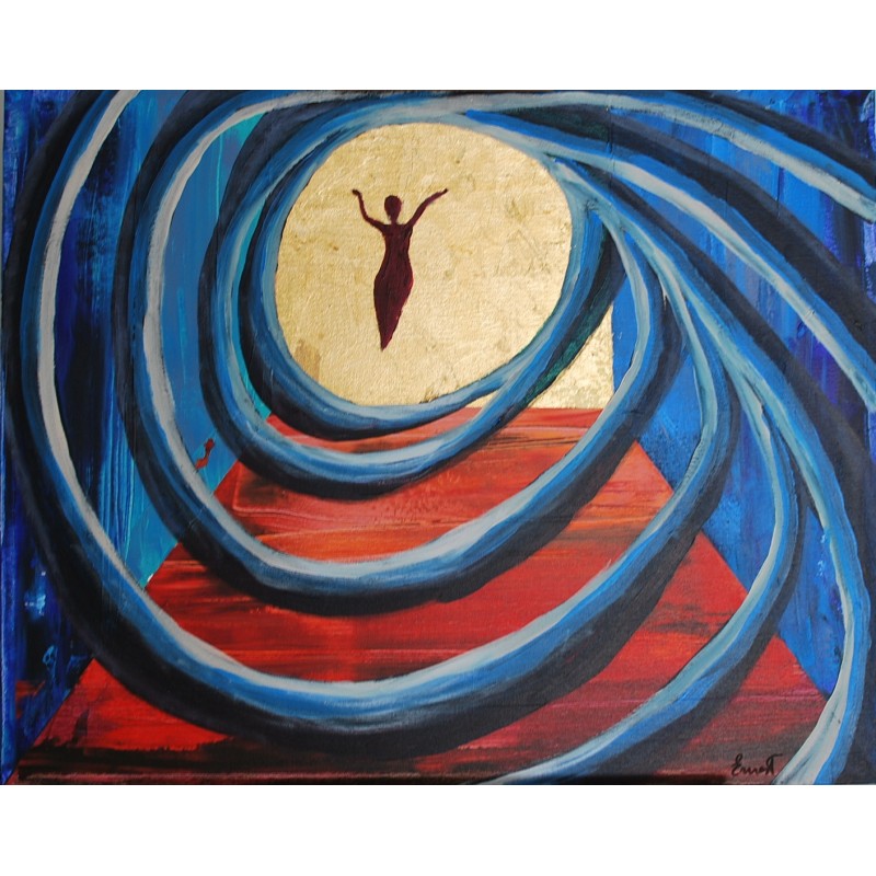 En esta obra, utilicé acrílico y dorado para fusionar el surrealismo con un estilo semiabstracto, creando un vórtice dinámico que representa la pasión y la emancipación. La figura central, etérea y en aparente levitación, simboliza la pureza y la libertad del espíritu humano. Cada pincelada y tono dorado están pensados para transmitir energía y movilidad, invocando una atmósfera de ensueño en cualquier espacio en el que se encuentre.