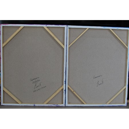 2 Lienzos estirados sobre marco de madera, pintados a mano con tecnicas acrílicas de medidas 147 x 93 x 4 cm.