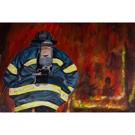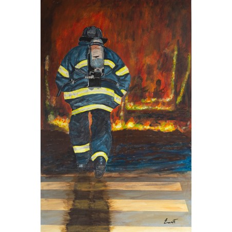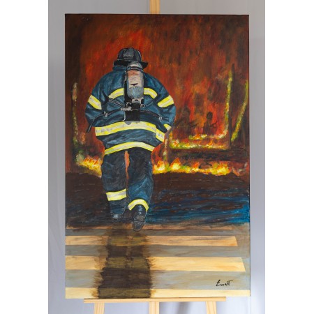 En esta obra he capturado la esencia valiente de un bombero en acción, utilizando acrílicos para expresar tanto la intensidad del fuego como la firmeza y el coraje del héroe que se adentra en él. Mi intención es evocar admiración y respeto hacia estos incansables luchadores, representando su lucha contra las llamas con un estilo que entrelaza lo figurativo y lo semiabstracto. Esta pintura no solo lleva energía y fuerza a cualquier espacio, sino que también sirve como un recordatorio de la valentía humana frente al peligro.