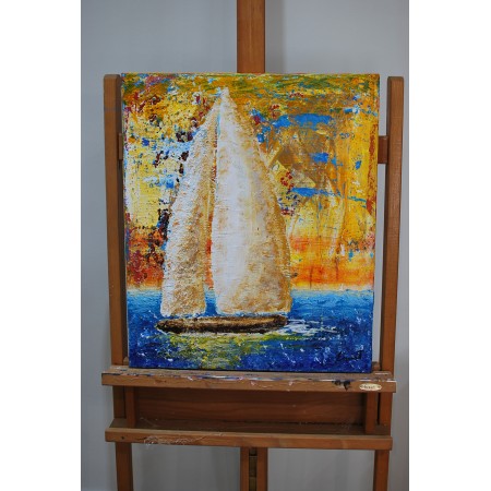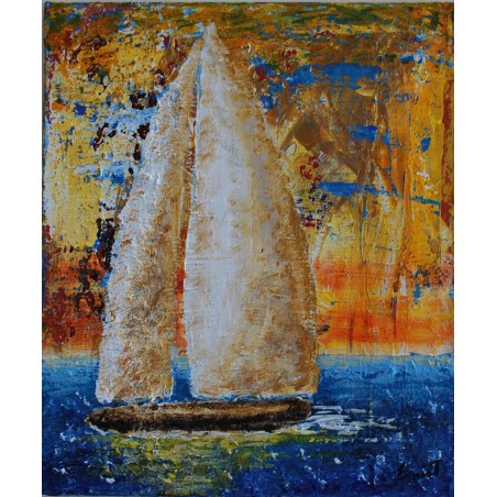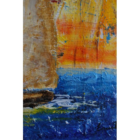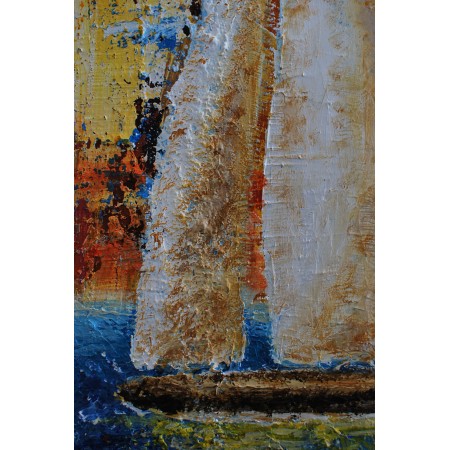 En esta obra, exploro la dualidad entre la representación figurativa y la abstracción. Utilizo acrílicos y técnicas de impresión en relieve para crear una textura rica que emula la esencia vibrante del mar y el cielo. Este velero, casi etéreo, simboliza un viaje tranquilo a través de la tumultuosa paleta de emociones humanas. Quise capturar tanto la calma como la intensidad que coexisten en nuestros espíritus y en la naturaleza. Esta pieza aportará una energía de paz y reflexión profunda a cualquier espacio.