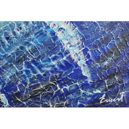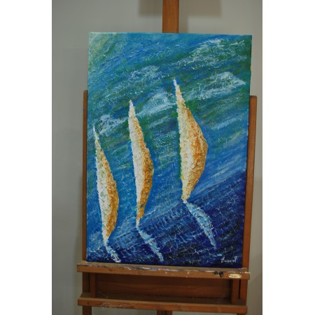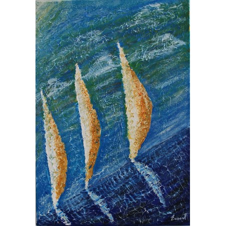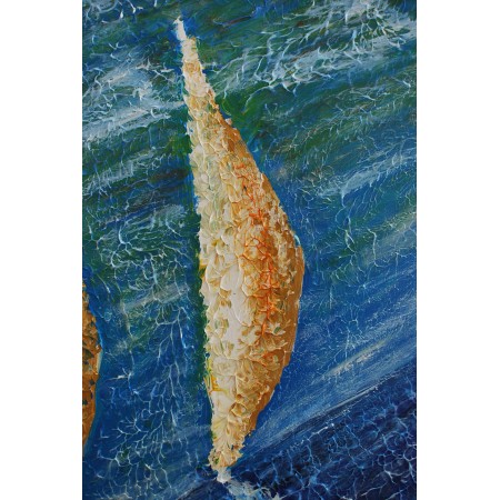 Mi obra a toda vela, transmite el vigor y la libertad del océano, donde las velas, representadas mediante la impresión en relieve, parecen danzar sobre las olas. Utilicé acrílicos para capturar la profundidad y la dinámica del mar, logrando un estilo que oscila entre el expresionismo y lo semiabstracto. Esta pieza es un canto a la valentía y la aventura, energía pura que revitalizará cualquier espacio.