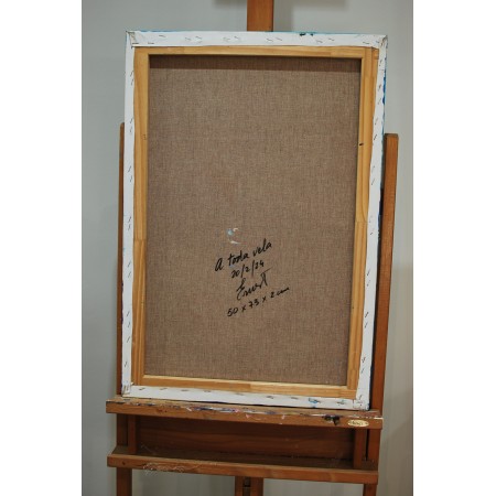 Lienzo extendido sobre bastidor de madera, pintado a mano con tecnicas acrílicas y de medidas 50 x 73 x 2 cm.