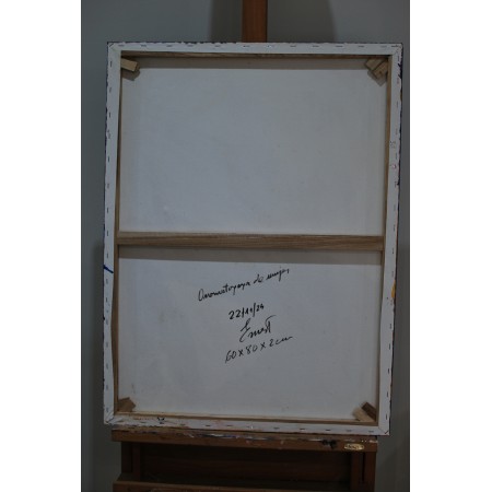 Lienzo extendido sobre bastidor de madera, pintado a mano con colores acrílicos y de medidas 60 x 80 x 2 cm.