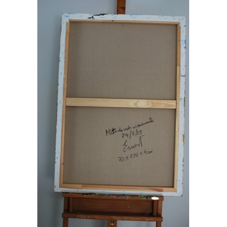 El lienzo está estirado sobre un bastidor de madera de 4 cm. de grosor.