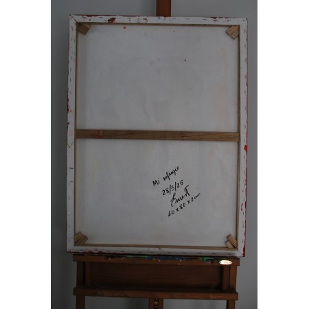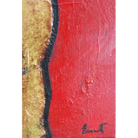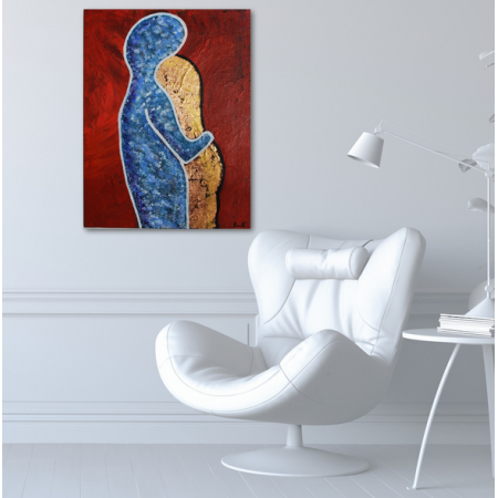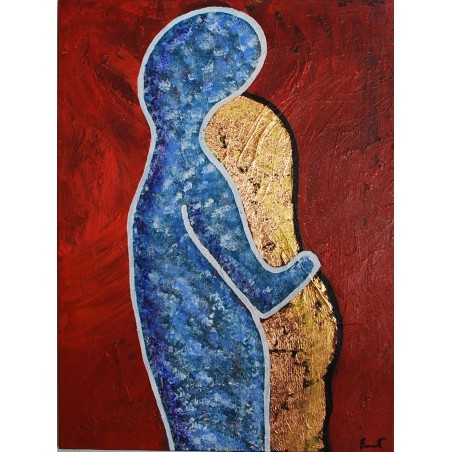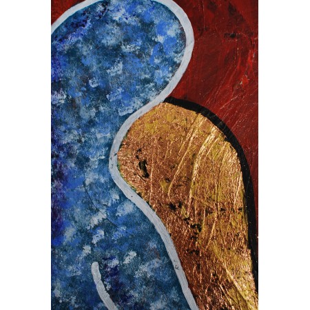 Dos siluetas entrelazadas se sostienen en silencio. El azul abraza al dorado como refugio emocional y protección mutua. Sobre un fondo rojo intenso, la obra habla de intimidad, cuidado, dependencia, conciente y la fuerza sanadora del vínculo humano profundo compartido.