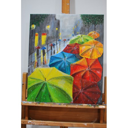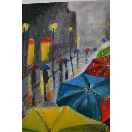 En "Lo que la lluvia guarda", paraguas vibrantes avanzan bajo un cielo gris urbano. La lluvia diluye contornos, refleja luces y protege intimidades anónimas. El color emerge como refugio emocional, transformando la rutina en memoria compartida, donde cada gota conserva historias silenciosas de tránsito, espera y esperanza cotidiana urbana colectiva.