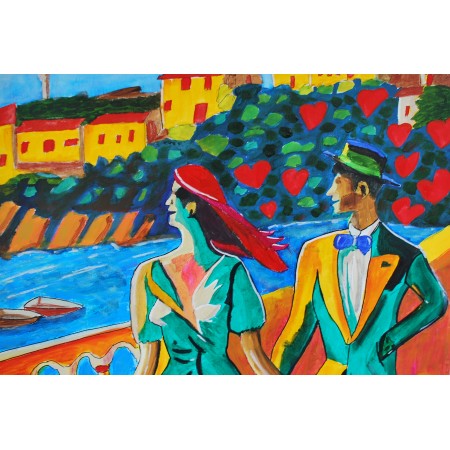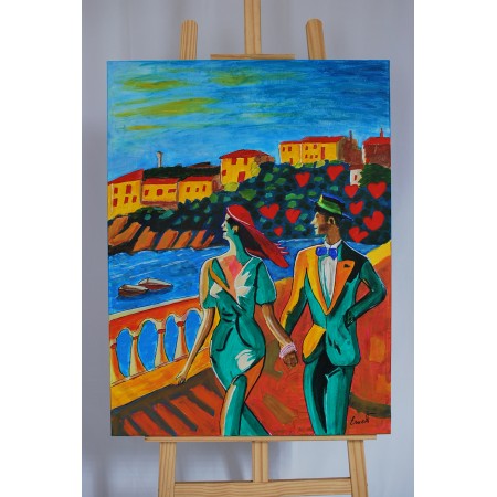 En esta obra, plasmé la vibrante energía del amor y la pasión con colores vivos y expresivos propios del fauvismo. La pareja paseando simboliza la unión y el camino compartido, destacando en un entorno semi-abstracto que juega con la forma y el color para evocar felicidad y dinamismo. Este cuadro no solo ilumina cualquier espacio con su calidez, sino que también invita a celebrar los momentos de conexión humana.